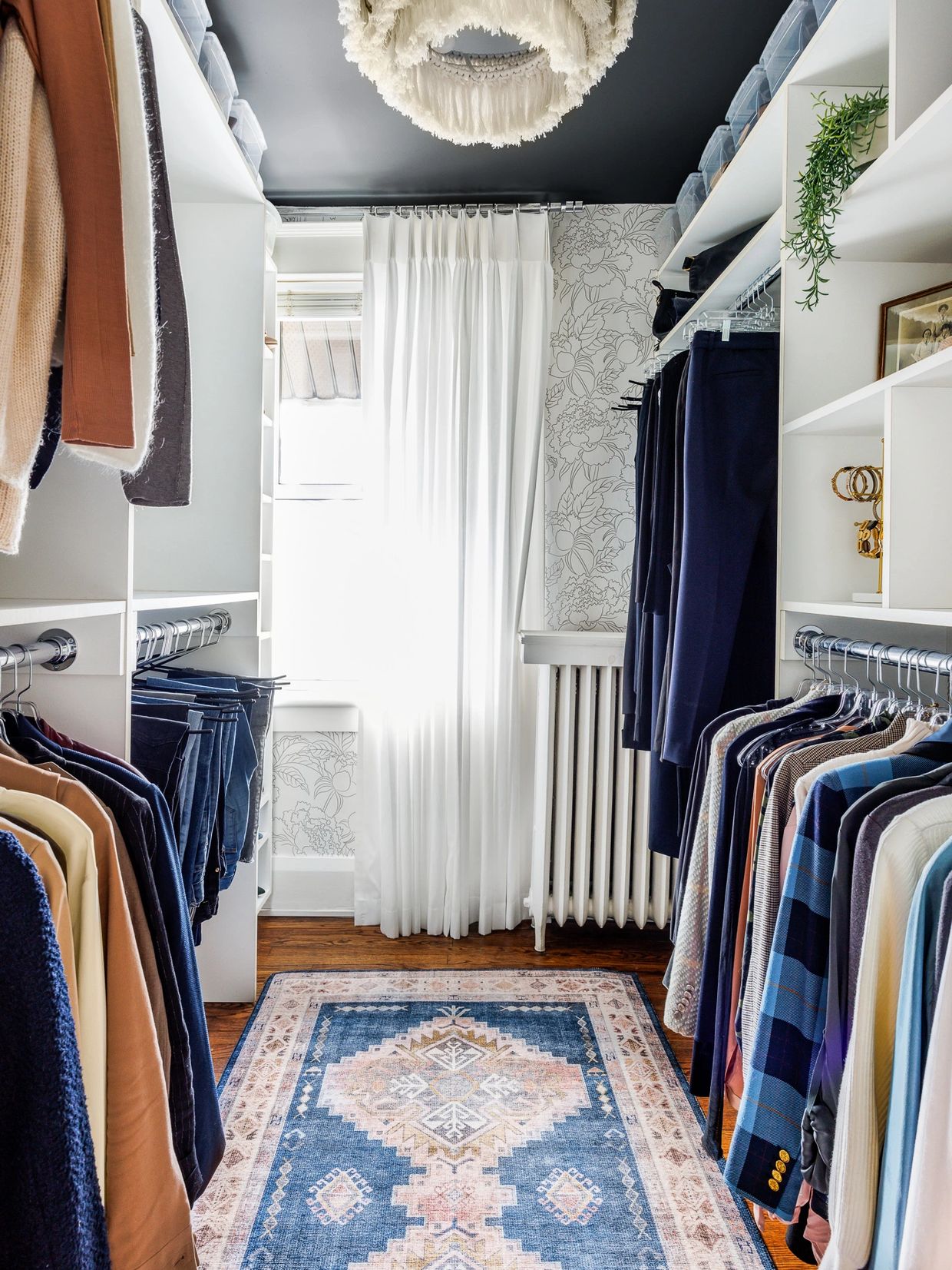 Lastly, a newly painted dark grey ceiling beautifully contrasts against the whimsical macrame light, adding the finishing touches to turn the space from a bedroom closet to a romantic, luxurious dressing nook.